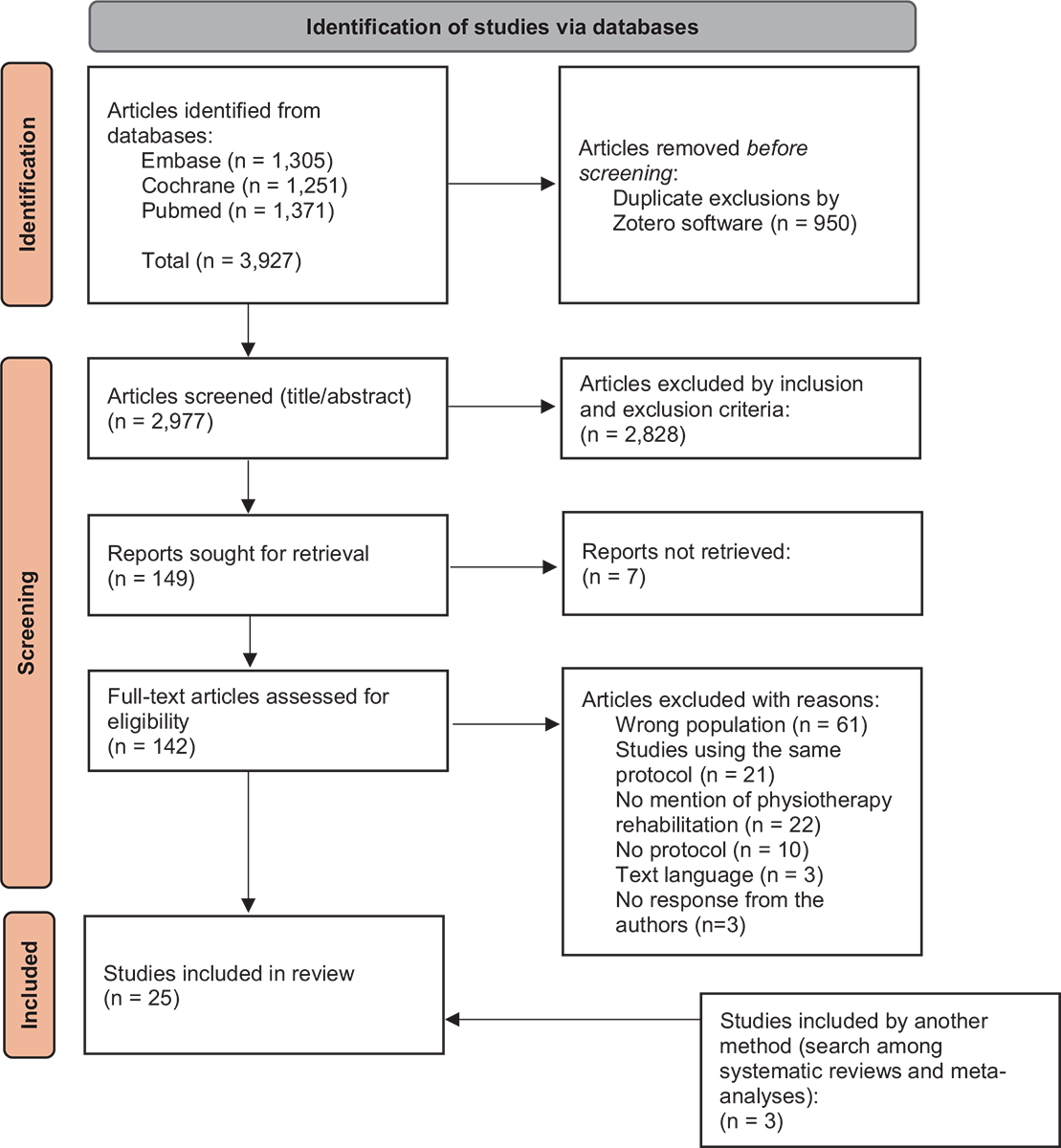 Two independent reviewers screened all titles and abstracts based on the selection criteria. A second screening was made by the examination of full texts. If two articles used the same rehabilitation protocol, the most recent article or the one with the better explanation was selected.