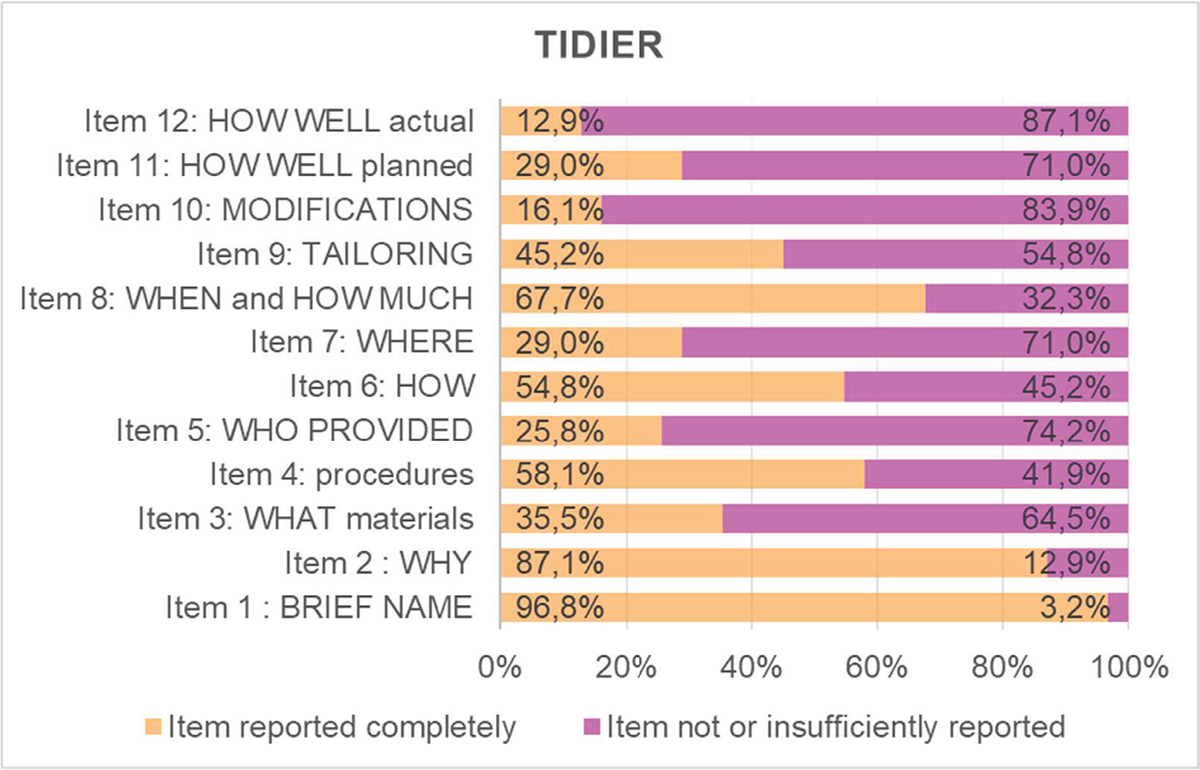 FIGURE 6 -. Percentage of TIDieR items completely, not, or insufficiently reported according to all selected protocols.