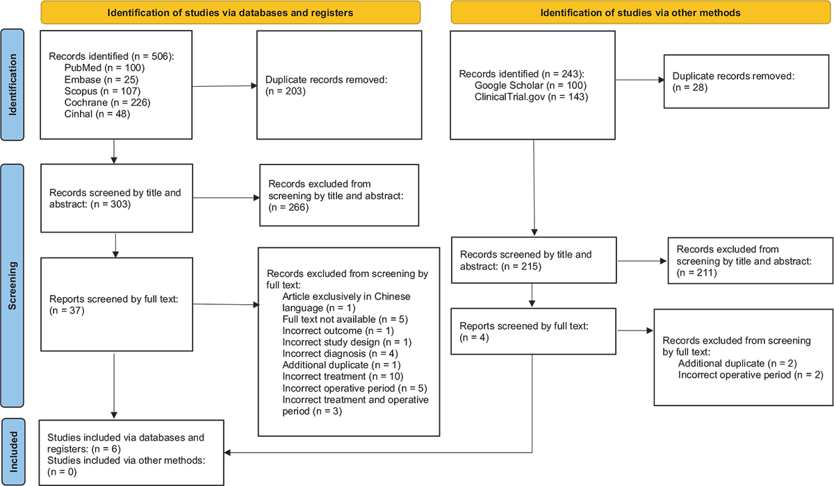 We retrieved 749 records: 506 from databases and registers, 100 from Google Scholar, and 143 from ClinicalTrials.gov. After removing duplicates (n = 231), we screened 518 records by title and abstract and read the full text of 41 trials. Finally, we included six trials encompassing 498 patients (36,9% men, mean age 69.0 years) (Fig. 1) (53-58). We detailed the reasons why all potentially relevant trials were not included in our review in Appendix B.