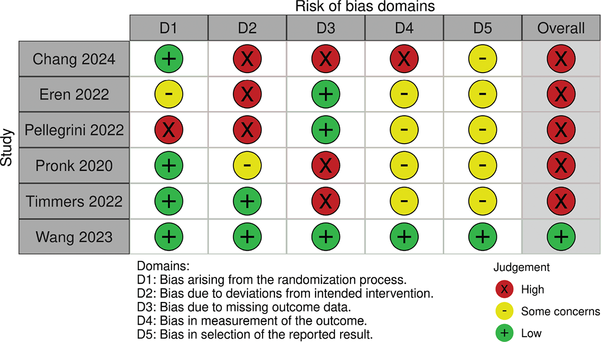 One trial was judged at low risk of bias (58). The other five trials were judged at an overall high risk of bias (Fig. 2) (53-57). We summarized the most credible findings (i.e., results with moderate to high-certainty evidence) in the evidence profile table (Table 2). All results are reported descriptively in the following paragraphs.