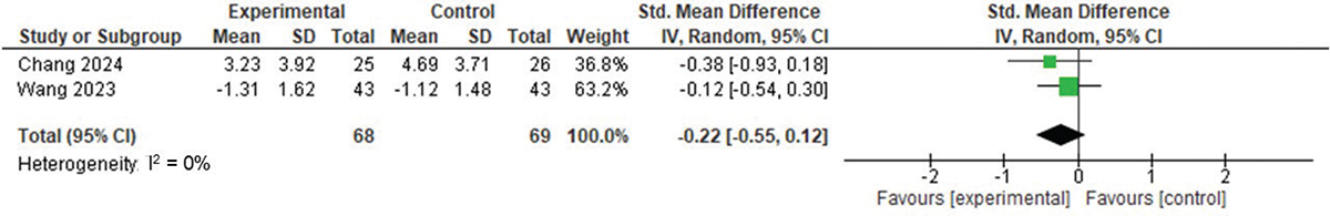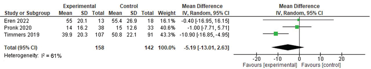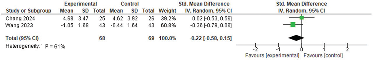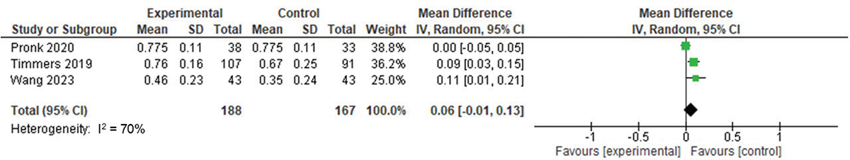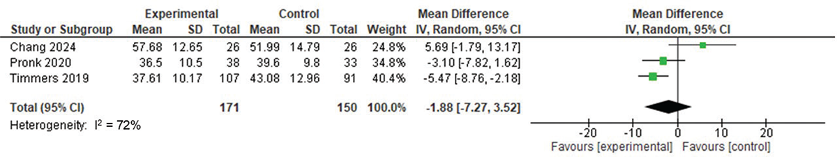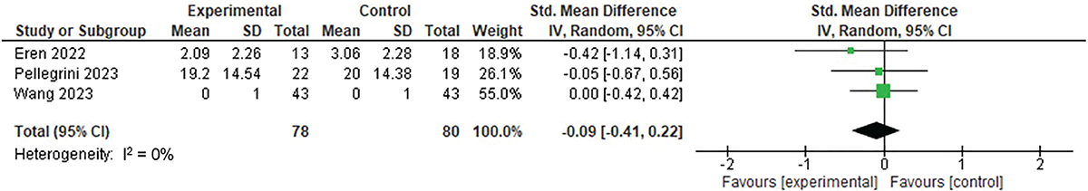 | 3 months | 3 | 158 | SMD −0.09 (−0.41-0.22) | Imprecision | Moderate | ||||||