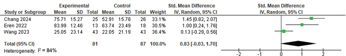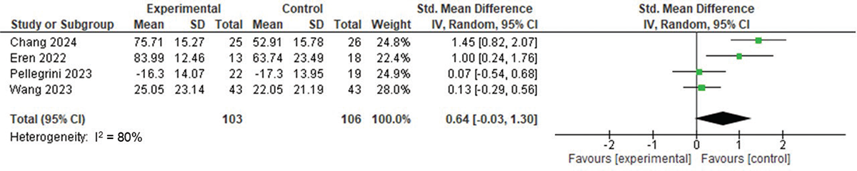 | 3 months | 4 | 209 | SMD 0.64 (−0.03-1.30) | Imprecision | Low | ||||||