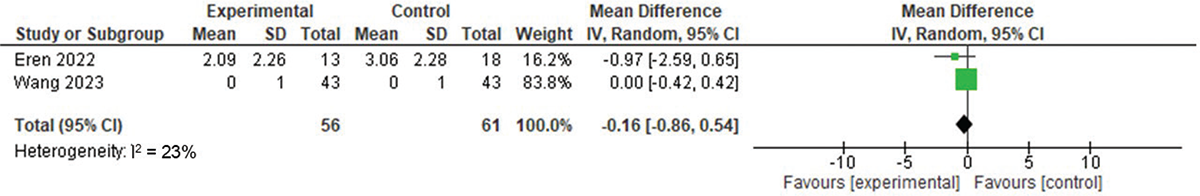| 1 month | 3 | 321 | MD −1.88 (−7.27-3.52) | RoB, Inconsistency, Imprecision | Very low | ||||||