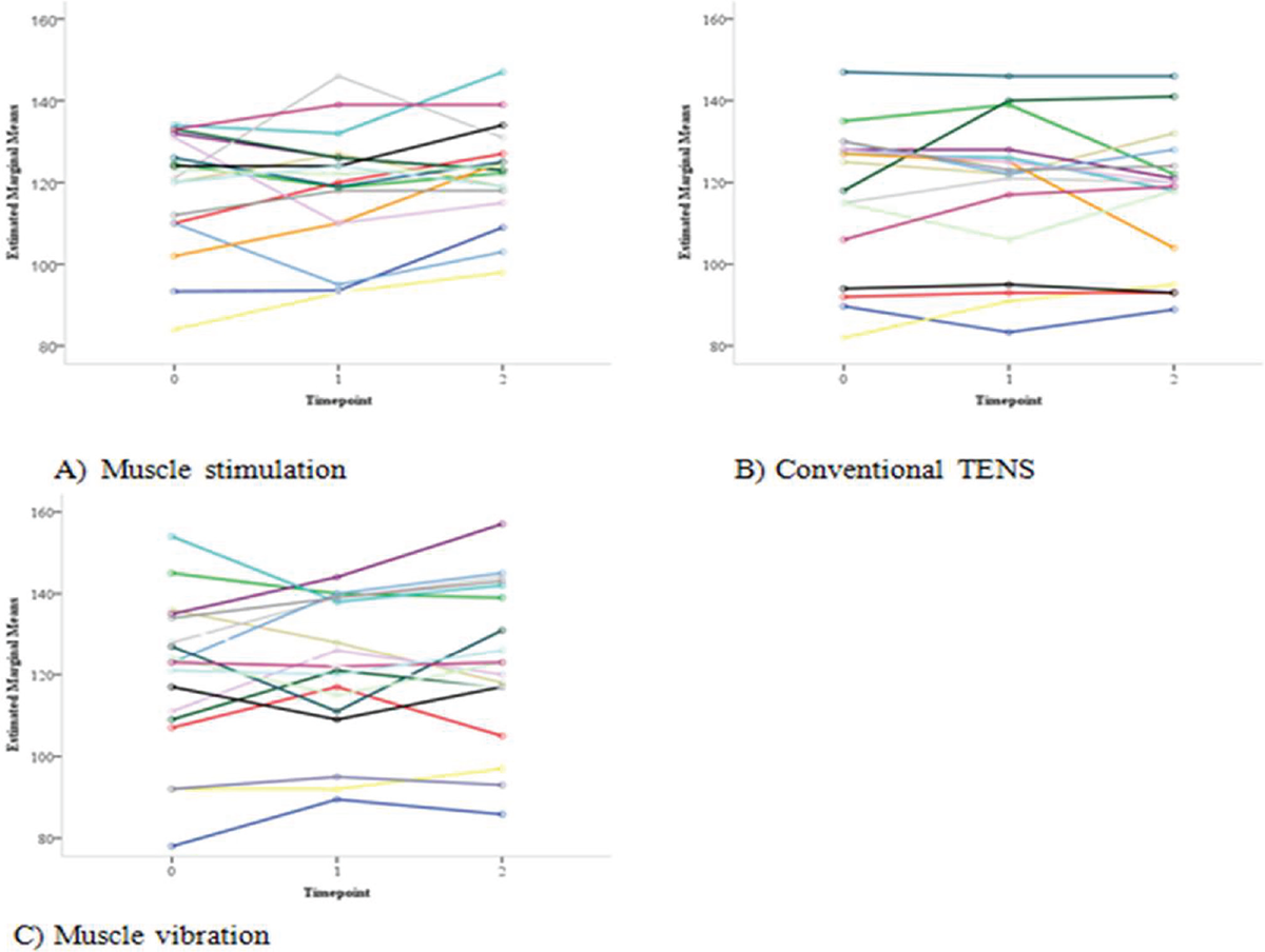 The evolution of individual full range neck rotation is presented at different time points. Visual inspection of patients’ neck rotation indicated variability in their responses to different interventions. Observing the individual graphs, most patients demonstrate a persistent increase in range of motion during muscle stimulation and muscle vibration immediately after the intervention. A schematic presentation indicates the variability in range of motion over different time points (Fig. 3).
