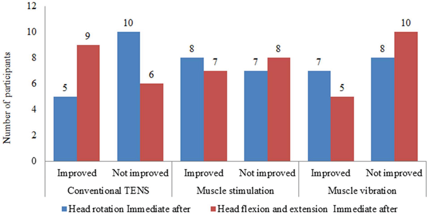 Results: Mean age of participants was 59.87 ± 8.9 years. Baseline CROM for rotation ranged from 87° to 137.6° and from 79° to 132.4° for flexion/extension. Improvements in neck rotation were observed in 5 (33.3%) participants after conventional TENS, 8 (42.1%) after NMES, and 8 (42.1%) after muscle vibration. Similarly, improvement in flexion and extension was observed in 10 (55.6%) after conventional TENS, 8 (53.3%) after NMES, and 7 (46.7%) after muscle vibration. Significant reductions in pain shortly after the three interventions were observed in patients experiencing pain.